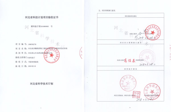 我公司在2016年肩负的河北省科学手艺厅科技立异平台建设运行经费项目,执行期为2016.1-2016.12。我司于2016年6月与省科学手艺厅签署了使命条约书,并获得了40万元的专项资金支持。我司自筹资金360万元,会同专项资金一起,用于我司那曲肝素钙产品的效果转化事情。2017年9月,本项目使命书划定的绩效指标所有完成,我司正式向省科学手艺厅提出了项目验收申请。2018年6月,本项目顺遂通过河北省科学手艺厅的验收,并获得验收证书。